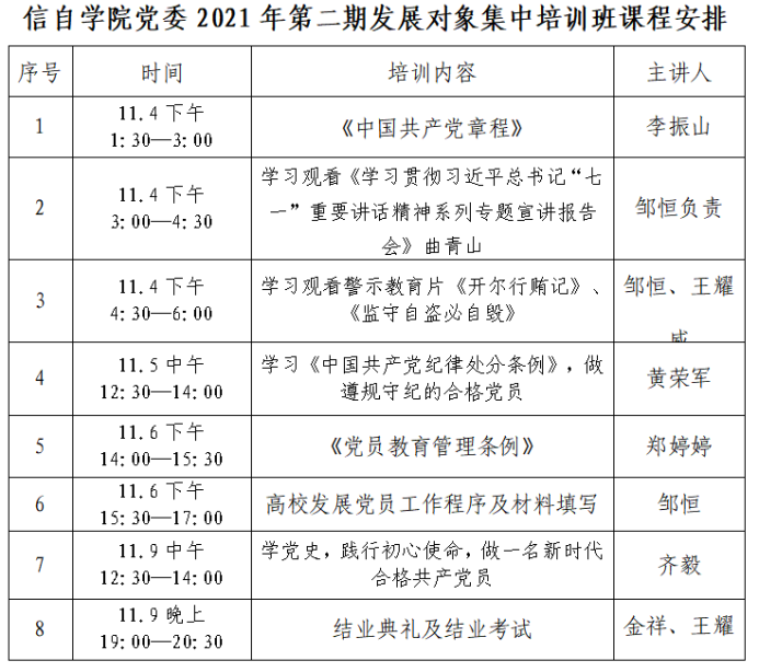 2021年第二期发展对象集中培训班于信自235举行,对2021年11月学院党委备案通过的54名发展对象进行了8个专题24个学时的集中培训,具体安排如下表: