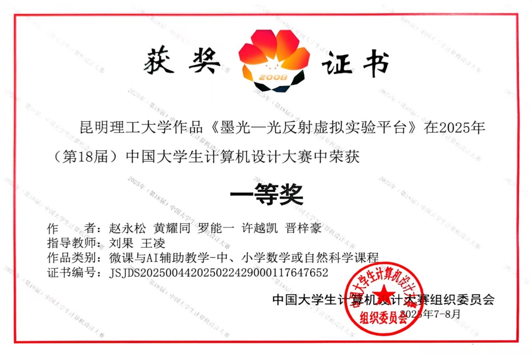 由赵永松、黄耀同等同学创作的一等奖作品《墨光-光反射虚拟实验平台》还被评为特色优秀作品,在南京大学面向全国高校师生进行展演。
