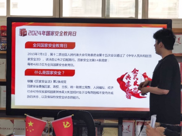 活动第一阶段,支部书记万松同志结合“4·15”全民国家安全教育日宣传教育活动,组织党员深入学习总体国家安全观的新理念新要求、国家安全相关法律法规,典型警示案例分析、保密意识常识教育等活动,推动国家安全宣传教育广泛深入普及,进一步增强广大师生国家安全意识。
