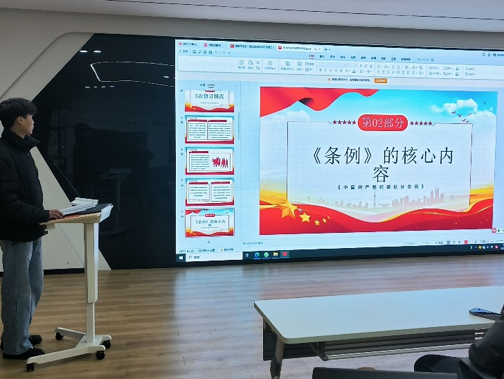 活动第二阶段,韩杰同志带领全体党员学习党章的内容和《中国共产党纪律处分条例》的部分条文,并针对新增条款进行了详细解读。全体成员一同观看《条例》知识的视频资料,重点强调了党内纪律的重要性,并要求每位党员忠实履行职责,勇于自我革命,提升政治觉悟和坚定性。