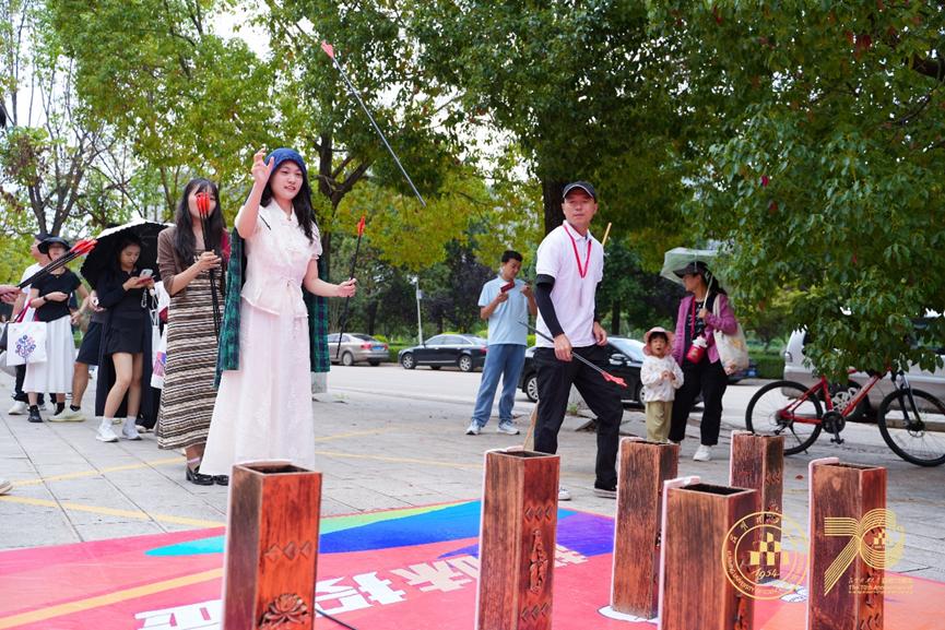随后的趣味活动拉开了庆典的序幕。校友们积极参与飞盘投掷、传统投壶等游戏,并在背景墙前合照留念。
