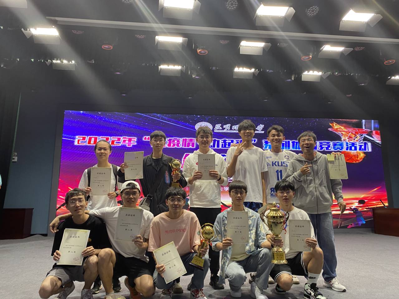 颁奖仪式开始,各学院代表上台领奖。我院学子在“抗疫情、动起来”系列竞赛活动中奋勇拼搏,喜获佳绩。其中,男子“三好杯”排球赛勇夺第一,女子队获第三名;“昆工杯”足球赛获第二名;“三好杯”3x3篮球赛一组第五名、二组第六名;乒乓球混合团体赛一组第二名、二组第七名;游泳比赛获第八名;"LYB"羽毛球获第四名;网球比赛精英组女子单打王雯昕同学荣获第三名,刘星雨同学荣获第五名;男子单打李哲贤同学荣获第一名,但奇逊同学荣获第六名,邓发荣同学获第七名;网球比赛阳光组女子单打余艳超同学荣获第三名,男子单打郭云川同学荣获第一名,赵伟枫同学荣获第四名;力量三项比赛飞家龙同学荣获男子第一名,谢欣阳同学荣获男子第二名。最后,颁奖仪式在一片热烈的掌声中结束。
