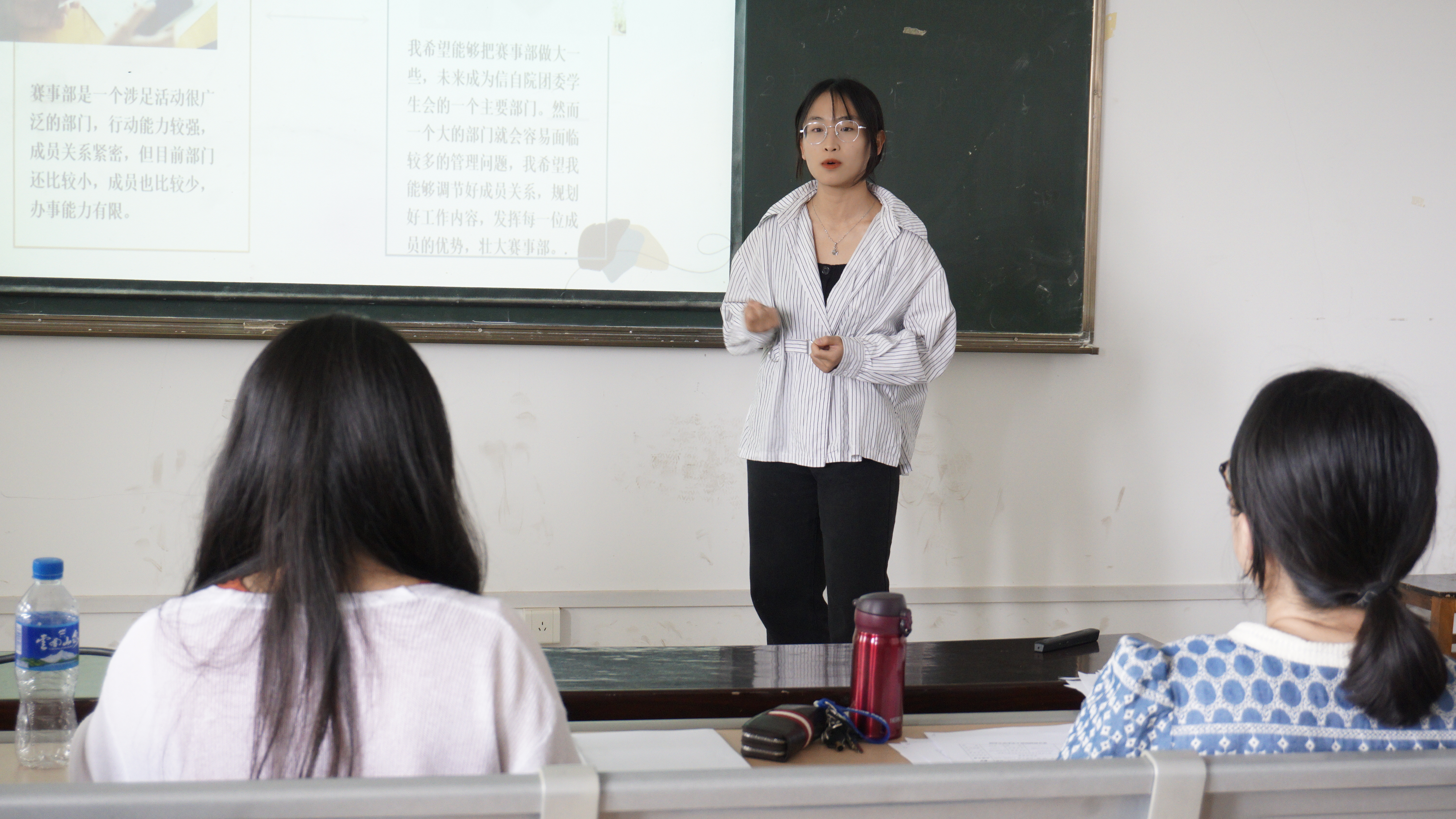 于信自楼617教室开展团委、学生会及艺术团主要团学干部选拔竞聘工作。本次换届选拔工作由学院团委马金晶老师、万松老师及学院团学组织主要负责人担任评审小组成员。