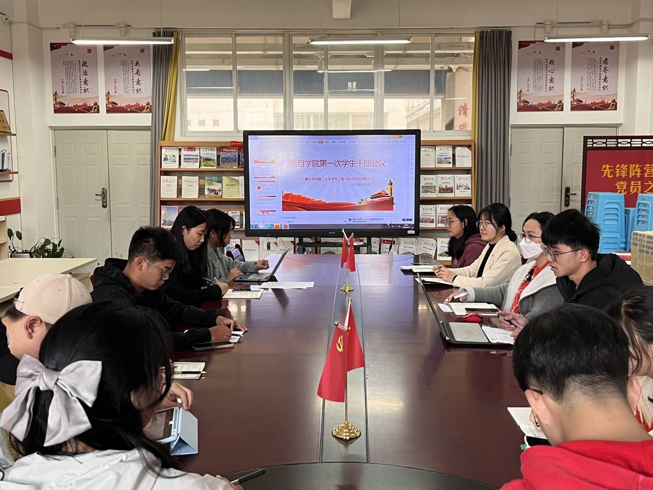 团委在信自楼235室召开了新学期学生干部工作会议。团委负责人马金晶老师、万松老师、苏蕊老师以及学院团委学生会中高层学生干部参加了本次会议。