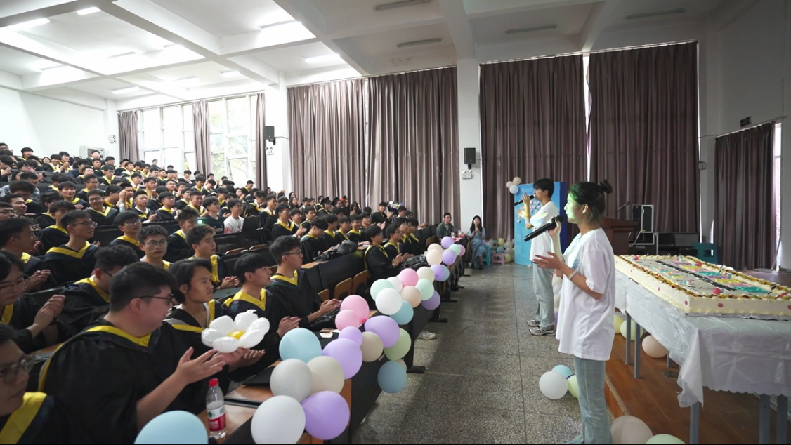 随后,毕业生代表游译娴、马旺分别发言。总结了求学时光的收获与感悟,并为25届毕业生送上诚挚的祝福,表达了对学院老师和同窗的感恩和不舍之情。学弟学妹们也带来了精心准备的节目,他们用歌声表达了对学长学姐的美好祝福。台下的观众们被深情的歌声所感染,纷纷挥舞手臂,全场自发的大合唱将气氛推向高潮。