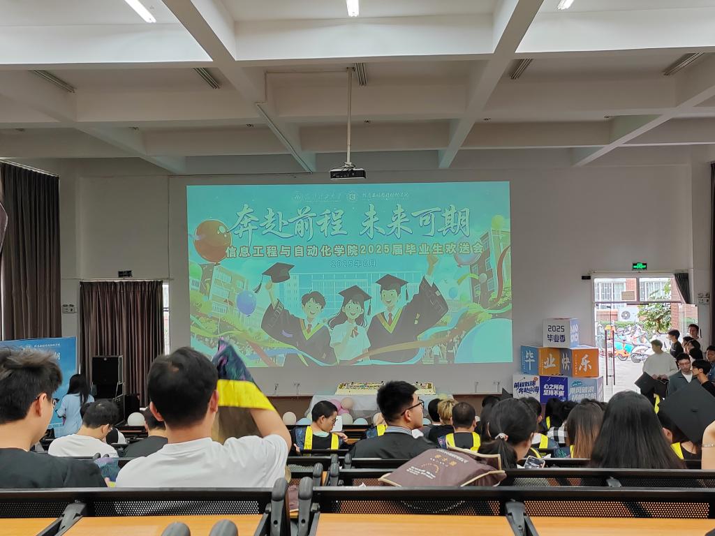 在信自100报告厅举办“奔赴前程·未来可期”毕业欢送会。学院党委书记齐毅、院长王红斌、党委副书记郑婷婷及2025届毕业生班主任、辅导员和全体毕业生共同参加。